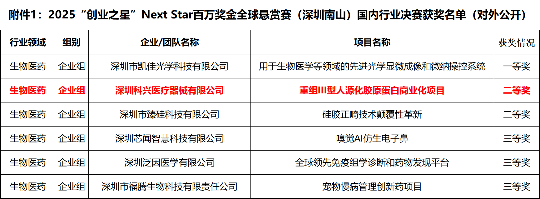 近日,科興制藥全資子公司-深圳科興醫(yī)療器械有限公司(簡(jiǎn)稱“科興醫(yī)療器械”)的重組Ⅲ型人源化膠原蛋白商業(yè)化項(xiàng)目(GB14項(xiàng)目),在第十七屆中國(guó)深圳創(chuàng)新創(chuàng)業(yè)大賽南山創(chuàng)賽——2025“創(chuàng)業(yè)之星”NextStar百萬(wàn)獎(jiǎng)金全球懸賞賽(深圳南山)中脫穎而出,榮獲生物醫(yī)藥行業(yè)決賽企業(yè)組二等獎(jiǎng),公司研發(fā)實(shí)力得到認(rèn)可。
